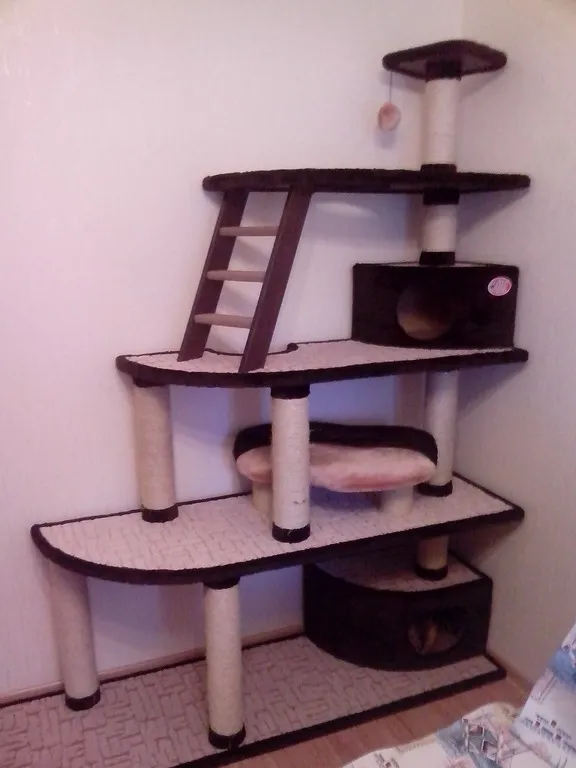 · Правильные материалы: плотный сизаль для точения когтей, мягкий плюш для сна, прочный картон для заточки и игр.