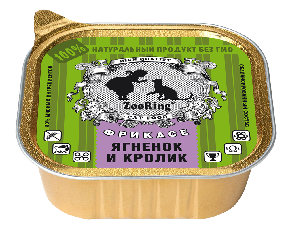 Мясо и субпродукты не менее - 80% (в том числе ягненок - минимум 5%, кролик - 10%), таурин, клетчатка, витамины (А - не менее 180 МЕ, Е - не менее 0,5 мг, Д3 - не менее 0,6 мкг), микроэлементы (цинк, йод, марганец), антиоксиданты.